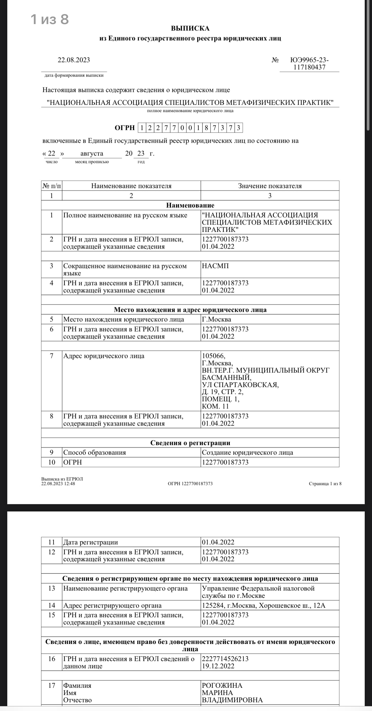 Наименование: "НАЦИОНАЛЬНАЯ АССОЦИАЦИЯ СПЕЦИАЛИСТОВ МЕТАФИЗИЧЕСКИХ ПРАКТИК" Юридический адрес: 105066, город Москва, Спартаковская ул, д. 19 стр. 2, помещ. 1 ком. 11