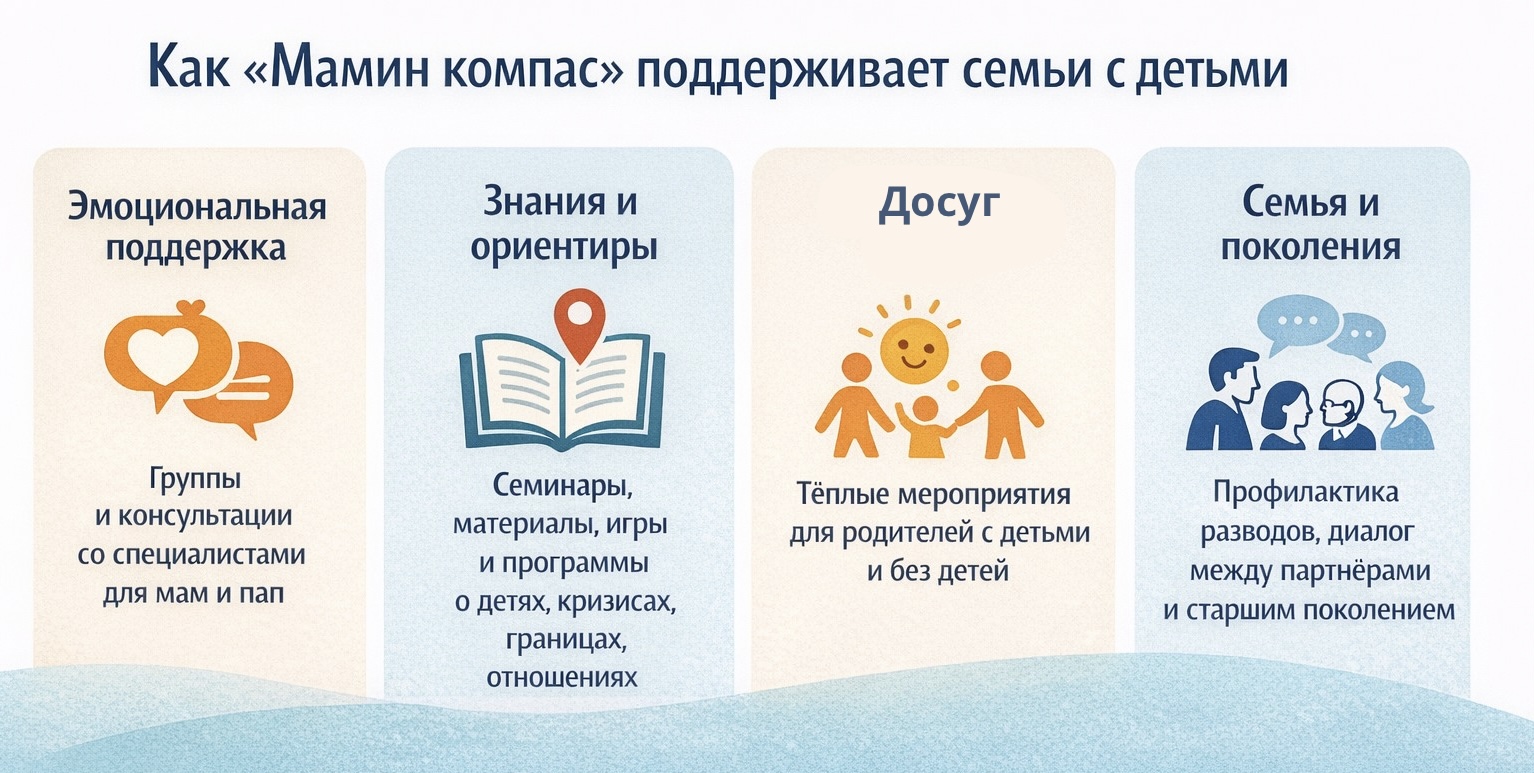 «Мамин компас» — социальный проект, который выстраивает устойчивую систему поддержки семей, начиная с мамы и охватывая всю семью: ребёнка, отца, партнёрские отношения и связь поколений. Мы не закрываем «один запрос», мы меняем среду, в которой растут дети и живут взрослые.