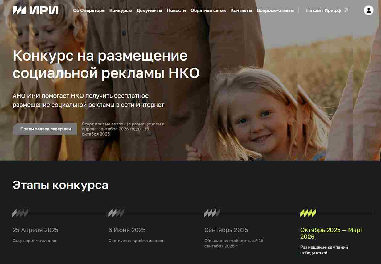 Для того, чтобы ваша социальная реклама оказалась в интернете и набирала миллионы показов, вы можете принять участие в Конкурсе на размещение социальной рекламы НКО. Конкурс проводится 2 раза в год. Подать заявку, узнать о необходимых документах и найти ответы на вопросы можно на сайте Конкурса. Очередной конкурс стартует 15 октября. Победители будут объявлены в сентябре 2026 года.