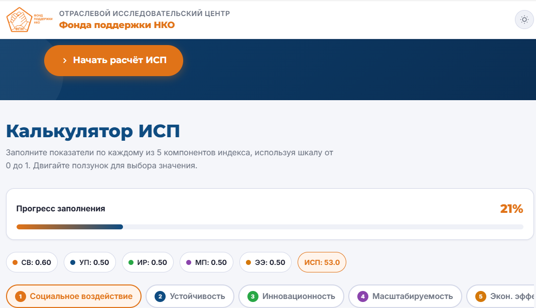 Калькулятор ИСП позволяет НКО, грантодателям и представителям органов власти самостоятельно провести оценку партнёрских практик, повысить прозрачность деятельности и выявить точки роста для развития социально ориентированных проектов.